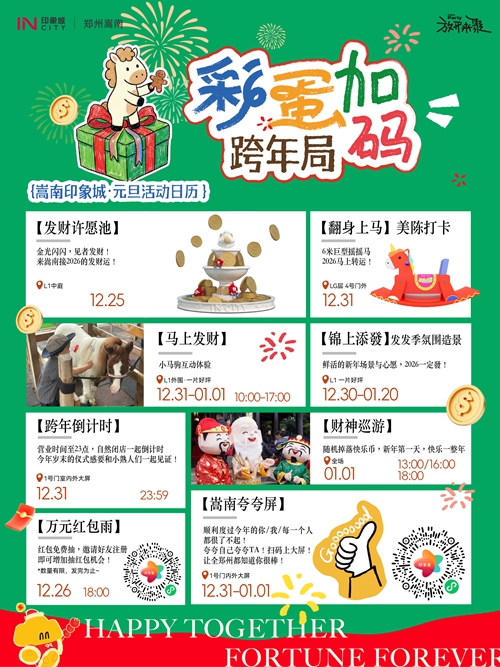 12月31日-1月3日,憑快樂(lè)幣可免費(fèi)騎小馬、抽獎(jiǎng)、兌換零食禮包,輕松實(shí)現(xiàn)童趣與味蕾雙重滿(mǎn)足??缒暌?,商場(chǎng)營(yíng)業(yè)時(shí)間延長(zhǎng)至23:00后自然閉店,大屏同步跨年倒計(jì)時(shí),和親友一起在歡呼聲中迎接2026,氛圍感直接拉滿(mǎn)!